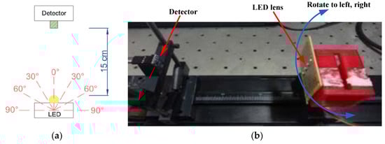 (a) The schematic diagram of luminous flux vs LED lens rotation angle measurement. (b) The actual system of luminous flux vs LED lens rotation angle measurement.