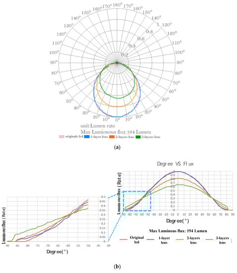 Figure 18a, shows that the luminous flux of a single-layer lens LED was greater than that of a no LED lens when the LED lens rotation angle was more than −73° and 72°; the two-layer lens had a significantly higher luminous flux when the LED lens rotation angle was more than −64° and 58°; and the luminous flux of a three-layer lens was more pronounced when the LED lens rotation angle was more than −61° and 57°. Figure 18b, a cartesian graph, can more clearly show the various phenomena as described in Figure 18a. From Figure 18a,b, it can be seen that if the layers of n increase, the luminous flux of the high rotation angle will be improved.