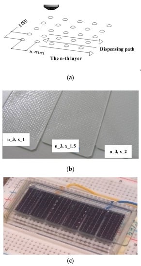 (a) Lens array spacing distance x(mm) and dispensing path. (b) Lens array dispensed on the glass as a mask (n: Layer; x: Spacing distance (mm)). (c) Glass lens array applied to mask solar cells.