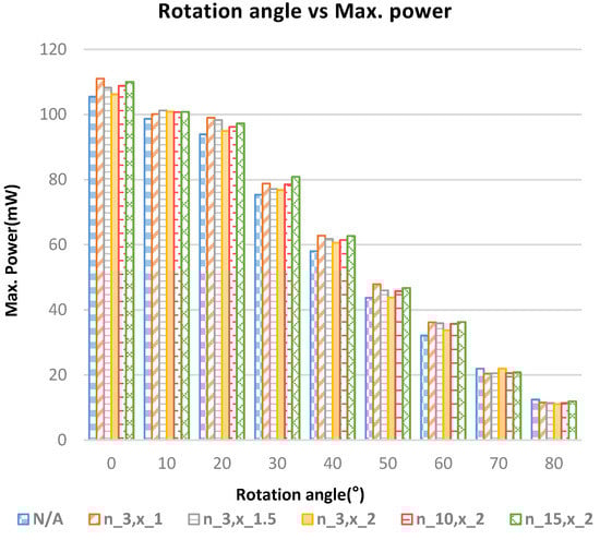 The relationship between the solar cell rotation angle and maximum power of different lenses (n: Layer; x: Spacing distance mm).