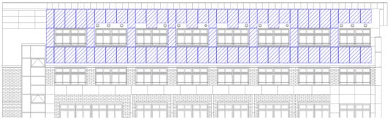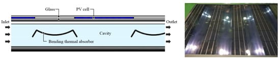 The air-type BIPVT collector designed for this study is shown in Figure 5. Unlike existing commercial modules, which are covered with PV cells, this model had PV cells and glass alternately arranged in the module. Each module consisted of about 36 monocrystalline silicon solar cells between two glass layers (glass to glass). A thermal absorber made of a thin sheet of metal coated with blue inside the collector is installed at the intersection of the PV cell. Thus, solar radiation can reach the thermal absorber directly through the glass. The absorber is designed in the form of a curved surface so that solar energy can be incident at any angle. These plates act as baffles and help ensure smooth airflow inside the collector. This feature allows solar energy to enter and flow well even if the air-type BIPVT collector is installed vertically on the building’s facade. Thus, the thermal performance of the collector can be increased.