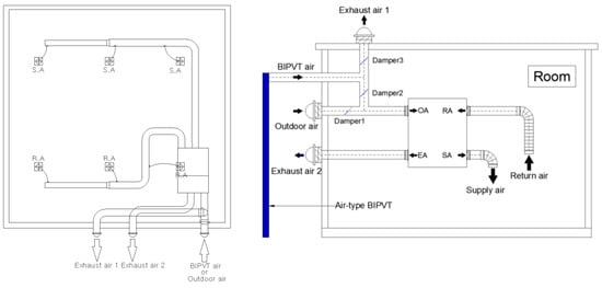 Air-type BIPVT collectors were installed on the south side of the building, with an area of about 123 m2 in total, at the elevation of the four classrooms. The PV generation capacity of the 72 collectors installed was 10 kWp. The electricity generated was directly used in the building, and the preheated air was used as a heat source for the building load. Two classrooms were linked to an air handling unit (AHU) that used preheated air as a heat source for ventilation and heating from the collector (Figure 3). The air supply temperature was determined by controlling the flow rate of the air supplied from the outside to the BIPVT by controlling the sensible heat of the outside temperature and the set indoor temperature. Proportional control was performed using a damper to adjust the set indoor air temperature. In the other two classrooms, the method of operation was to use the air heat source directly or to exhaust it (Figure 4).