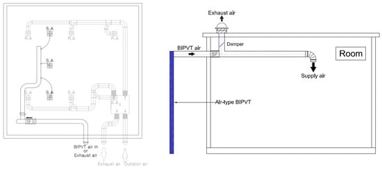 In Figure 3, the AHU acts as a fan (500 m3/h) in the air-type BIPVT system. Therefore, the preheated air can flow into the classroom and can mix with outdoor air by the open ratio of dampers trough PID (Proportional-Integral-Differential)-control. The BIPVT system in Figure 4 was equipped with a supply fan (SF, 500 m3/h) to allow preheated air to enter the room.