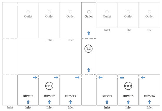 Figure 6 shows the internal flow path of an air-type BIPVT collector integrated to the facade of one classroom with three flow paths. In the figure, the flow path marked in bold provides a connection between the air-type BIPVT collectors and forms a “⊥” type flow path. In the figure, the flow path marked in bold provides a connection path between the pneumatic BIPVT collector and the collector and forms a “⊥” type flow path. This flow path can be disadvantageous to the internal flow characteristics of the fan at the outlet. Therefore, the air flow was analyzed by setting the inlet opening ratio for each collector so that the air would flow smoothly. Ambient air is introduced at the lower BIPVT 1–6 (six collectors) and the fluid is discharged through connected collectors to the upper outlet (D 150 mm).