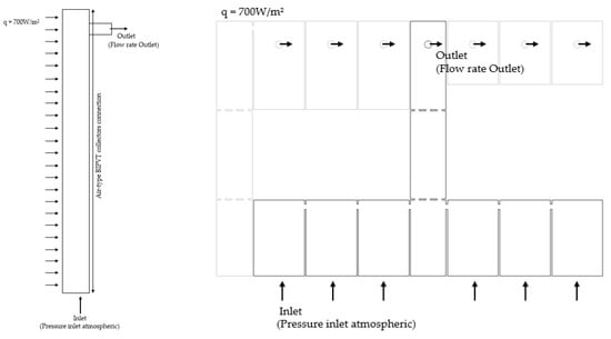 In order to set up four cases according to the inlet opening ratio, the inlet area was reduced and modeled. For simulation of the air-type BIPVT collector, the collector area was set at 14.28 m2, and thermal energy of 500 W per unit area was equally supplied to each case. In order to consider the surface heat loss of the collector, the outside temperature value was used as the input. The air density to be applied according to the temperature was specified at 1.225 kg/m3 (when the temperature was 25 °C). The gravity acceleration value was 9.81 m/s2 and buoyancy was applied. The computational domain and simulation conditions of the air-type BIPVT collector connection are showed Figure 7 and Table 2.