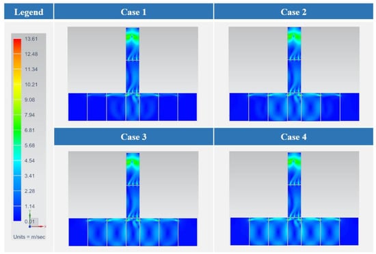 Figure 10 is a graph showing the inlet velocity according to inlet opening ratio. In case 1, for all BIPVTs with the same inlet opening ratio of 100%, the inlet velocity slowed to 0.0113–0.214 m/s. The inlet velocities of cases 2, 3, and 4 were higher than that of case 1; especially, the inlet velocities of BIPVT 3 and 4 were higher than those of the other inlets. Case 4 shows that the flow velocities (about 3.8 m/s) of BIPVT 3 and 4 (opening ratio 5%) were higher than those of the other cases. This was because the inlet velocity increased as the inlet opening ratio decreased for the flow (500 m3/h) discharged to the outlet.