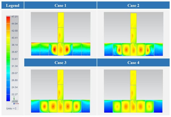 Accordingly, the temperature distributions within the collectors were different from each other, as shown in Figure 9. In case 1, high temperatures were concentrated in the middle of the connected collector. On the other hand, in cases 2, 3, and 4, as the air inflow increased in BIPVT 1 and 6, the portions where the central high-temperature was concentrated gradually become uniform. As it passed through the collector, air flowed more smoothly in case 4 than in case 1, and the air flow became longer.