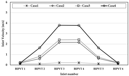 For the simulation analysis, four cases were designed with different opening ratios of air-type BIPVT 1–6. When the collector’s inlet opening ratio was 100%, the inlet area was 0.0755 m2; in all cases, BIPVT 1 and BIPVT 6 were the same, when the opening ratio was 100%. The opening ratios of BIPVT 2 and 5 were reduced to 100%, 50%, 25%, and 10% depending on cases (Table 1), and the opening ratios of BIPVT 3 and 4 were reduced by half (100%, 25%, 13%%, and 5%) compared to those of BIPVT 2 and 5. The opening ratio of the inlet near the outlet was reduced so that the air flow could be evenly distributed from the outlet to the far collector.