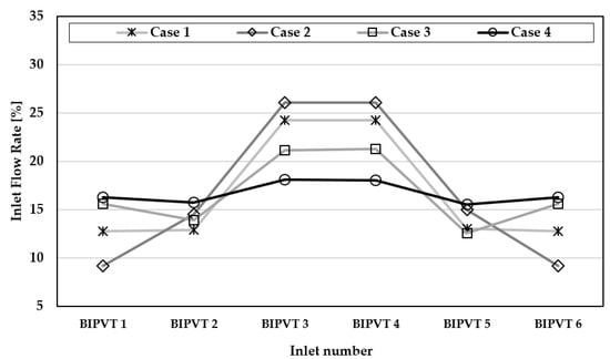 Figure 11 is a graph showing the inlet flow rate distribution according to the opening ratio. In cases 1 and 2, the inlet flow rates of BIPVT 3 and 4 were two times higher than those of the other inlets. On the other hand, case 4 had more uniform flow distribution than the other cases. Therefore, it was thought that BIPVT 3 and 4 should have small opening ratios and high flow rates in order to maintain uniform air inflow amount for each BIPVT collector.