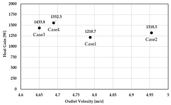 Figure 12 is a graph of the heat gain according to the outlet velocity. When the flow velocity of the air-type PVT collector’s outlet is high, air flowing inside the collector passes through with little heat gain. The outlet velocities of cases 3 and 4 were 4.65 m/s and 4.69 m/s, respectively, which were relatively slow. Accordingly, the heat gains of Cases 3 and 4 were high at 1433.8 W and 1552.3 W, respectively.