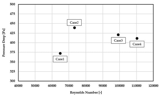 The pressure drop inside the air-type BIPVT collector is as important as the heat transfer performance because it is related to the blowing (fan) power. As the pressure drop in the collector increases, the power required for flow increases and the heat transfer performance decreases. The Reynolds number is the ratio of the force due to inertia to the force due to viscosity (Equation (1)) and is a factor determining laminar flow and turbulence. If the Reynolds number is high, the flow is classified as turbulent. The characteristics of this flow (turbulent flow) are fast and turbulent, such as when a vortex occurs. Thus, the heat transfer and heat diffusion effects in the BIPVT collector are strong.