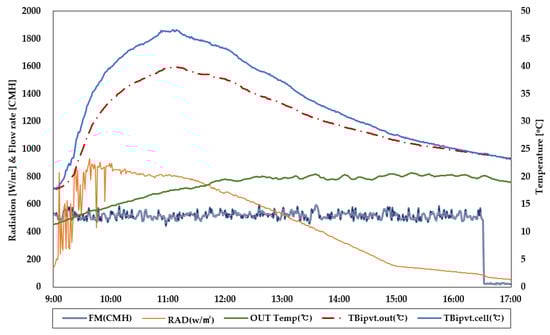 Based on the simulation results, the performance of the air-type BIPVT collector applied to the south side facade of the demonstration building was analyzed. Figure 14 is a graph showing the ambient conditions of a clear day (22 March 2018) and the flow rate and cell temperature of the air-type BIPVT collector. Preheated air from the collector applied to the facade enters the building’s AHU (air handling unit) system. The flow rate of the collector was kept at 500 m3/h when the AHU system fan was operated.