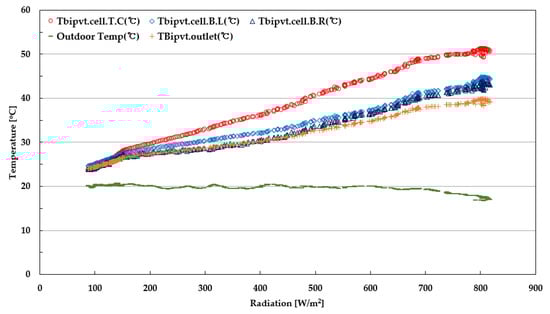 Figure 15 is a graph showing the temperature characteristics of the connected air-type BIPVT collectors. The temperature characteristics of the collector confirm the backside temperature of the PV module and the temperature difference between the inlet and outlet of the collector. First, the temperature of the backside of the PV module was measured at two bottom points and at one top center point of the connected collector (Figure 6); the temperature of the backside of the module increased as the solar radiation increased. The temperature of the upper PV module of the collector was also consistently about 7 °C higher than the temperature of the lower module. Next, the inlet/outlet temperature difference of the collector was found to increase with the increase of the irradiation amount and reached 20 °C or more.