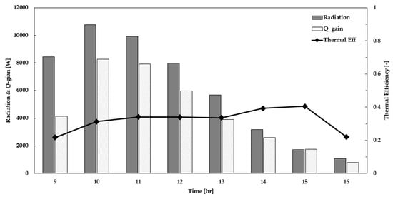 Figure 16 is a graph showing the daily hourly thermal performance of the air-type BIPVT collector. The amount of solar radiation per day was 650–800 W/m2; the amount of solar radiation input into the collector was an average of 6 kW/h. As a result, the thermal energy produced by the BIPVT collector was an average of 4.4 kW/h. The thermal efficiency of the coupled air-type BIPVT collector was calculated by substituting the actual measured solar irradiance and the collector inlet/outlet temperature difference into Equation (2). The thermal efficiency on the day of the experiment was analyzed and found to be 33.4% on the average; this value showed a difference of about 6% p from the simulation result of 39.5%.