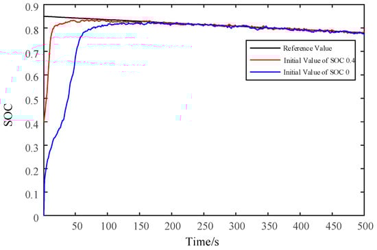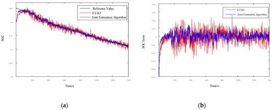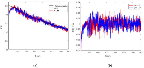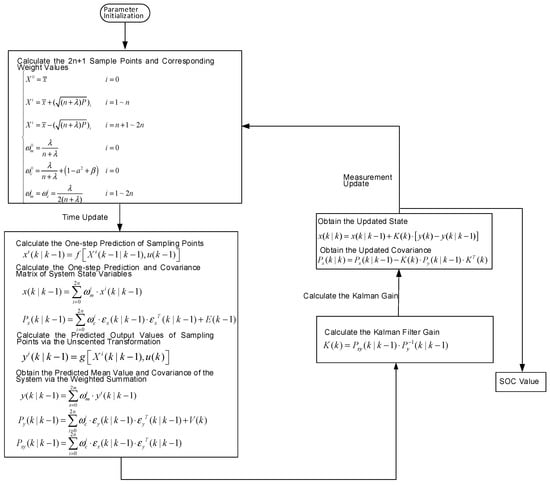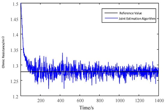 - Parameter initialization. First, initialize the corresponding parameters of the F-UKF algorithm for the battery SOC estimation; then, initialize the corresponding parameters of the F-UKF algorithm for the ohmic resistance estimation, and the ohmic resistance should be close to the actual value to ensure the fast convergence of the battery SOC.