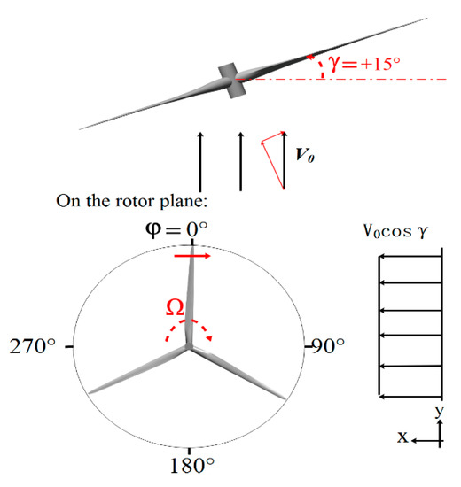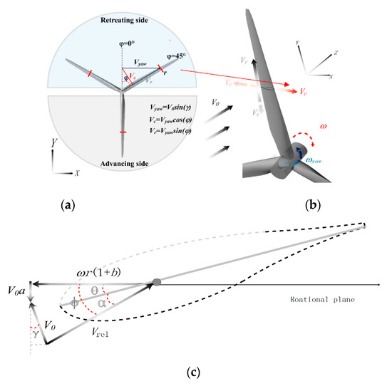 Figure 8 shows the velocity diagram under the yawed condition. A velocity component exists in the blade revolution plane and can be projected into radial and chordwise components denoted