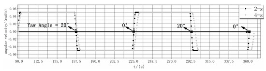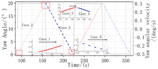 Figure 18. Cases 1,3,4,6 include the forward-start yaw, forward-stop yaw, backward-start yaw, and backward-stop yaw, respectively. For Cases 2 and 5, the yaw angle is 10° and they represent forward yaw and backward yaw, respectively. The grey line in the figure illustration the variation of yaw angular velocity during the simulation, and shows that except the Cases 2 and 5, other cases are all in the simulation about the variation of yaw angular velocity.