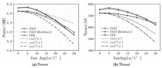Figure 7a, only a small amount of variation in rotor power can be observed under small yaw angles (≤5°). When the yaw angle exceeds 5°, the rotor torque significantly decreases as the yaw angle increases. The torque value computed using the BEM method, with or without the Beddoes stall model, is higher than the value computed by CFD since the BEM computation does not consider flow separation and flow transient phenomena. Zhu [
