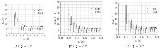 20] in the yawed simulation of a HAWT using the BEM model. Comparing the simulation results for CFD and FAST, the same trends can be observed along the blade span, whereas the AOA value is much larger than the FAST result.