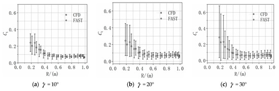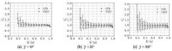 Figure 11 show the variation of aerodynamic load spanwise along the blade. For the axial flow, some large abnormal fluctuations in the AOA and aerodynamic loads can be observe d. Differences in the results of the CFD and FAST methods mainly occur along the inner board, owing to flow separation, which lead to smaller aerodynamic loads compared to those computed by the BEM model that does not consider flow separation.