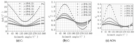 Vc, which causes the sectional load and AOA to fluctuate periodically. The maximum AOA and maximum load occur when the blade is in the 12 o’clock direction in the current simulation setup. Additionally, loads on the retreating side are much larger than on the advancing side.