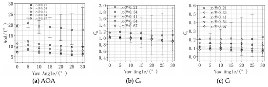 Figure 14 shows the variation of the averaged AOA with aerodynamic load at five typical spanwise sections with respect to yaw angle. Fluctuations of the aerodynamic performance are clearly observed and become larger as the yaw angle increases.