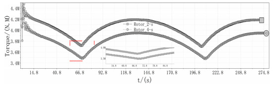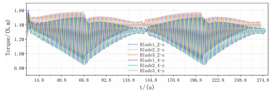 Figure 17 shows the variation of torque under different yaw rates in two periodic processes of start-stop yawing. Similarly, the torque of the blade under a 2-s duration is larger than the torque of the 4-s duration. Interestingly, the torque of the blade in the forward yaw stage (shown in