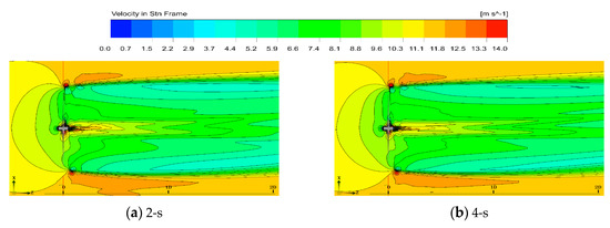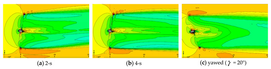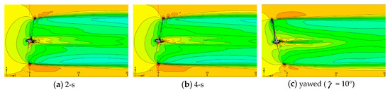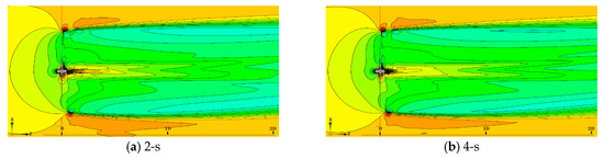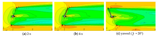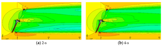 Figure 22 illustrates the velocity wake in the backward-yaw start stage. The wake zone velocity field retains almost the same flow structure. To refine the simulation results, large eddy simulations can be used to improve the interpretation of the flow process.