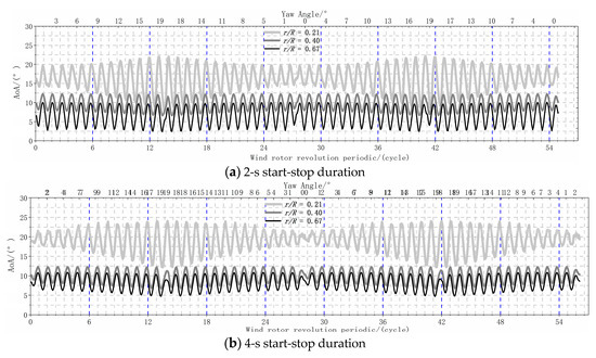 Figure 26a shows the calculated results of 2-s start-stop yaw rate. In this case, the start-stop velocity is faster, and the overall fluctuation are larger than those in the 4-s scenario. The start-stop effect mainly affects the AOA near the outer board but has less influence on other areas. In addition, the start-stop process leads to changes in the AOA.