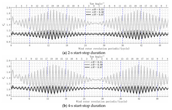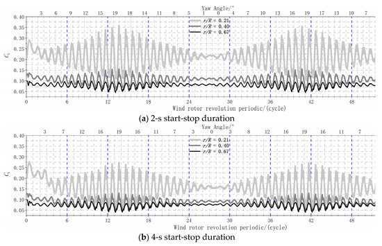 r/R = 0.21, 0.4, and 0.67). The results suggest the aerodynamic load inside the inner board is more influenced under dynamic yawing with the 2-s during than the 4-s duration. Fast shifts of the yaw angle under the yawing start-stop stage influence the aerodynamic load along the inner and middle blade span.