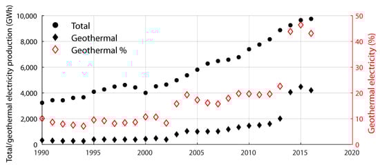 Evolution of electricity production and geothermal share in production for the period 1990–2015 for Kenya [4].