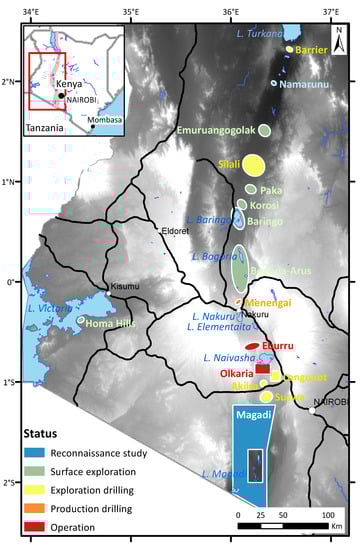 Map of the Kenyan Great Rift Valley showing the location of the main geothermal fields and their status as of 2018 (redrawn after [19]). The concession extent is only known for Olkaria [20], Longonot [1] and Magadi [21] fields. All the prospects (except Homa Hills) are located in an area of lower elevations (darker shades of grey) that represents the eastern branch of the East African Rift System (EARS, pink area in insert).