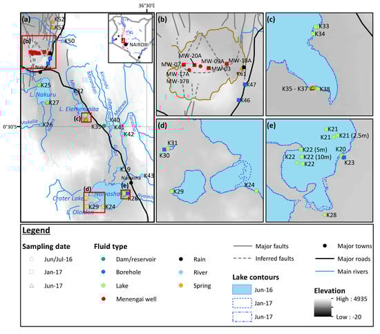 Locations of sampling points. (a) Entire study area; (b) Menengai Caldera; (c) Southeast shore of Lake Elementaita; (d) Southwest shore of Lake Naivasha, Lake Oloiden and Crater Lake; (e) East shore of Lake Naivasha. The faults were compiled from the available literature [17,33,34,35,42,44,54,56]. Lake shoreline indicators were digitised from Sentinel-2 and Landsat-1 satellite imagery [57] at the relevant dates.