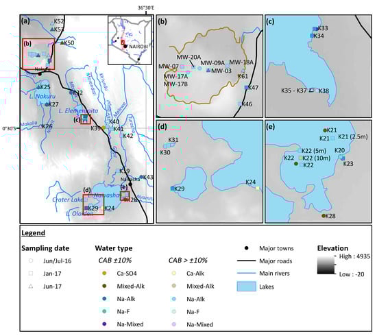 Fluid water type. (a) Entire study area; (b) Menengai Caldera; (c) southeast shore of Lake Elementaita; (d) southwest shore of Lake Naivasha, Lake Oloiden and Crater Lake; (e) east shore of Lake Naivasha. CAB: cation-anion balance.