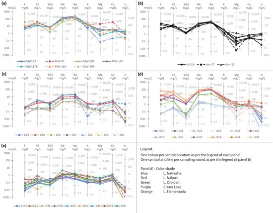 EC, alkalinity and ion concentrations were comparatively higher in borehole samples. This may have been due to longer residence times and increased water–rock interaction. Boreholes in the vicinity of the three springs (K46–47) have higher temperatures (>30 °C; Table S1). They have a similar chemical signature to the cold springs (Na-HCO3 water type; Figure 5) and comparatively high NO3− concentrations (Table S2)—again likely linked to farming—but with values below the WHO drinking water recommendation of 50 mg/L [63]. However, fluoride (F−) concentrations largely exceeded WHO guideline of 1.5 mg/L for safe drinking water (9 to 17 times this value; Table S2 & Figure 6c). Two other boreholes were sampled twice each (in June–July 2016 and January 2017). These boreholes are located on the shore of Lake Naivasha and Crater Lake (K23 and K30 respectively; Figure 3). They have similar chemical signature samples to K46 and K47 (Na-HCO3 water type; Figure 5), but ion concentrations were higher (Table S2 and Figure 6c). Only K30 had nitrate concentrations above detection limit but they were negligible (<1 mg/L). Some variability between the two sampling rounds was observed for some ions (e.g., Br−, K− and Li+ for K23; Table S2).