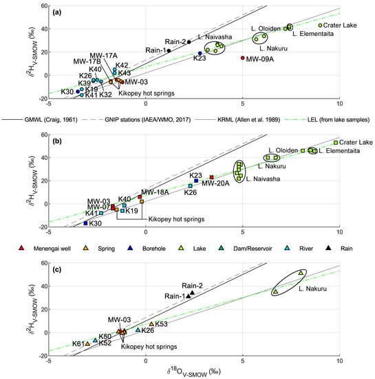 δ18O and δ2H data plots from the study area. (a) Sampling from June/July 2016; (b) sampling from January 2017; (c) sampling from June 2017. GMWL: Global Meteoric Water Line [64]. GNIP: Global Network of Isotopes in Precipitation data from Kericho and Muguga stations [65]. KRML: Kenya Rift Meteoric Line [8]. LEL: Lake Evaporation Line fitted by least square regression to all lake data collected by the authors.