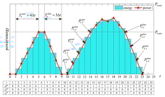 In Equation (1), the marginal generating cost of an IRES unit is assumed to be zero. A user group with decremental willingness-to-pay and an IL agent with incremental bidding prices are modeled as user groups with different willingness-to-pay and agents with different bidding prices. The same modeling method is applied to generating units with incremental bidding functions too. The start-up cost includes the energy production cost and the cost of providing fixed upward ramping capabilities during the start-up process. Likewise, the energy production cost and the cost of providing fixed downward ramping capabilities during the shut-down process are included in the shut-down cost . Therefore, Equations (2) and (3) only consider the energy produced by a unit during its dispatchable state (i.e., = 1). The bidding function for energy production of unit k in Equation (2) also reflects the unit’s energy production cost.