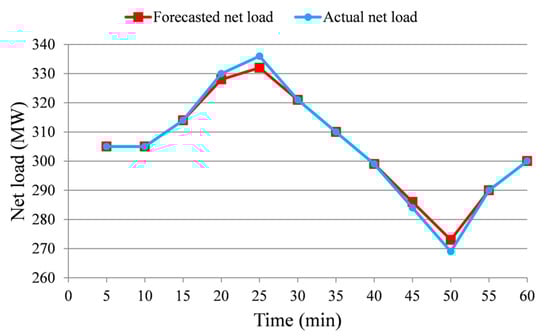 A typical scenario is generated for elaboration. The curves of the forecasted and actual net load are shown in Figure 3. As can be seen, the forecast is accurate in most time periods except some periods such as t = 4, 5, 9, and 10. Furthermore, whether there will be an error in the forecast for the actual overall load and IRESs output in period t will not be known until it is very close to time t. If the forecast is completely accurate, then despite the fluctuation of the net load curve, the IRESs curtailment or load shedding can be avoided even though FRPs are not considered in the RTUC/RTED. As a baseline, Table 4 below first displays the power outputs of generating units and the IL in each period when the forecasts for the net user load and IRESs output is accurate.