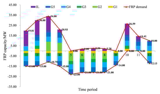 The actual power outputs of generating units and IL in the typical scenario where β = 0.9 and Rac = $1500 are shown in Table 5. Taking the uncertainty into consideration, upward and downward ramping products exceeding the forecasted variations in the net load are procured in order to contain the operational risk. The actual demand and supply of FRUs and FRDs are displayed in Figure 4, in which FRU is represented by the red curve in the positive domain and FRD is represented the red curve in the negative domain. It should be clarified that G2 only provides FRP from t = 4 to t = 5, though it provides ramping capabilities during its start-up or shut-down processes.