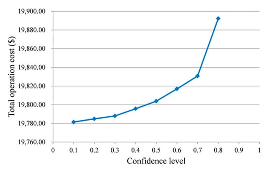 In the simulation, it is set that Nscen = 30 and scenarios are generated based on the data in Figure 2. One can then calculate the expectations of the total operation cost, the social surplus, probabilities of load shedding and IRESs curtailment, and quantities of the shed load and the curtailed IRES in the scenarios with and without FRPs, respectively. The simulation results are given in Table 3. In the scenarios with FRPs, three models (fixed FRP demand, varied FRP demand and the risk-limiting model proposed in this work) are adopted for comparison. In the model with fixed FRP demand, the values of and are set as 10 MW. In the model with varied FRP demand, the FRP requirements are determined by the confidence interval of the forecasted net load.