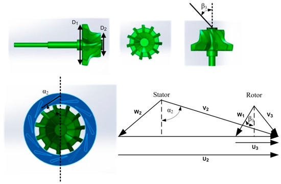 Figure 4 shows the Balje diagram used to calculate the value of the exit radius. The value of efficiency is in range 0.2–0.8 and the recommended value of is in range 0.53–0.66.