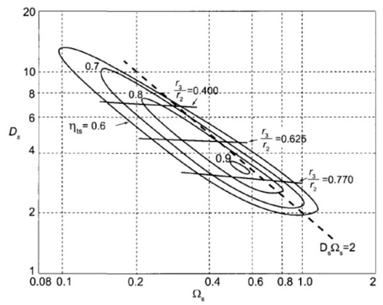 Balje diagram for a radial turbine [Reproduced with permission from [22], Seppo, A. Principles of Turbomachinery; John Wiley & Sons: New York, NY, USA, 2011.].