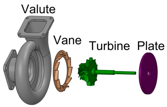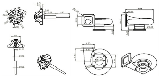 The turbo-generator parts use calculated values from Table 3 for drawing in Computer Aided Design (CAD) models of the rotor and volute with the size and shape shown in Figure 6. The overview of all parts is shown in Figure 7.