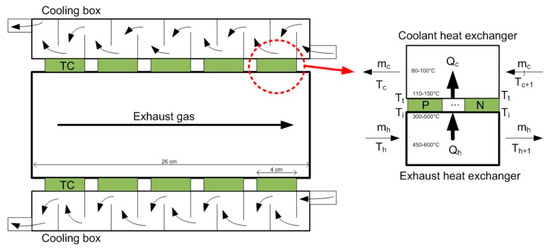 where is the conversion efficiency, is the thermoelectric generator power output, is the exhaust gas mass flow rate, is the exhaust gas specific heat, is the exhaust gas system inlet temperature, and is the exhaust gas system outlet temperature.