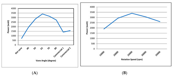 Generated power results. (A) Results showing the vane angle and power and (B) results showing the rotation speed and power.