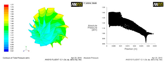 The value of the pressure is shown in Figure 15. Pressure reached the maximum at the inlet and was lower at the outlet. The value at the inlet was 1.67 atm, at the volute was 1.46 atm, at the turbine blade was 1.20 atm, and at the outlet was 1 atm.