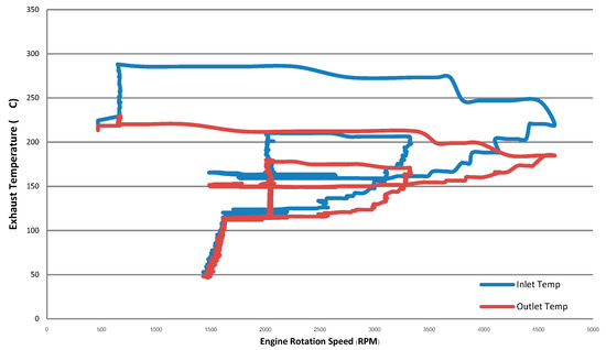 The temperature of the exhaust gas depends on the rotation speed of the engine and the engine running time. At the beginning of the rotation, the exhaust gas temperature was lower. It will increase as the speed of the engine increases, as a result of the heat combustion of exhaust gas. The inlet temperature was higher than the outlet temperature since the direct proportion characteristics.