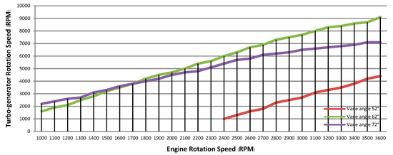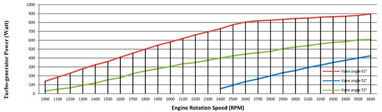 The rotational test of the rotation speed of the turbo-generator was undertaken by running the engine and adjusting the accelerator speed from idle to maximum speed, along with an adjustment of the vane angle testing set. The results are shown in Figure 18. The graphs show the correlation value between the rotation speed engine and the turbo-generator rotation speed with 10 times the repeat experiments for calculating the average value, as shown in the graph. The experiments measured the engine rotation speed in the pulley position of the engine, measured the turbo-generator rotation speed in the axis position of the turbo-generator and recorded the value from the starting point of the engine at a lighter speed (700 rpm), and then accelerated the engine speed to the maximum speed (3600 rpm). The X-axis shows the engine rotation speed in rpm. The Y-axis shows the turbo-generator rotation speed in the rpm. The red line shows a 52° vane angle turbo-generator rotation speed, the green line showing a 62° vane angle turbo-generator rotation speed, and the blue line displaying a 72° vane angle turbo-generator rotation speed.