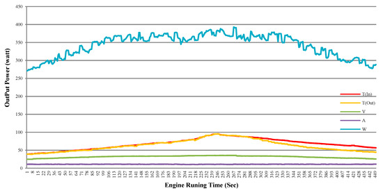 The power output from the thermoelectric generator shown in Figure 24. The graph shows the relationship value between the engine running time and the thermoelectric-generator output power, with 10 repeat experiments for calculating the average value. The experiments consist of measuring the engine running time when starting the engine and measuring the thermoelectric-generator output power in the power cord position. The values were recorded from the starting point of the engine at 700 rpm, and accelerated the speed of the engine to the maximum speed (3600 rpm). The X-axis is the engine running time, showing the value in seconds. The Y-axis is the thermoelectric-generator output power display value in watts. The red line is the inlet exhaust gas temperature, the yellow line is the outlet exhaust gas temperature, the green line is the output voltage, the purple line is the output current, and the blue line is the output power. The line-graph illustrates the exhaust temperature and power when running the engine. Overall, the power output is related to the temperature difference. To begin with, the power output started at 271 watts, before it increased to just under 392 watts at a higher temperature. This fell slightly when the engine was stopped, before dropping to its lowest point of 288 watts at the end of testing.