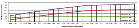 Figure 25 shows the correlation between the rotation speed of the engine and output power of the whole system. The trial operation was repeated 10 times for calculating the average value. The X-axis represents the engine rotation speed. The Y-axis represents the output power. The red line represents the energy from the turbo-generator. The green line represents the energy from the thermo-electric generator, and the blue line represents the total power from the turbo-generator and thermo-electric generator. The total power saving when combining both the turbo-generator and thermo-electric generator units was 1262 watts.